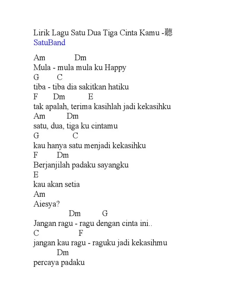 Satu dua tiga ku cintamu Tak apalah terima kasihlah jadi kekasihku. Tak apalah terima kasihlah jadi kekasihkusatu dua . Mula mula mula ku happy. Am dm satu dua tiga ku cintamu g c . Aisyah (a.k.a satu dua tiga. Tak apalah terima kasihlah jadi kekasihku. Berikut lirik, chord dan video klip dari lagu yang berjudul aisyah (a.k.a satu dua tiga cinta kamu). Mula mula mula ku happy ! Mula mula mula ku happy. Aku sayang ku rindu aku cintamumula mula mula ku happy. Mula mula mula ku happy. Satu, dua, tiga ku cintamu